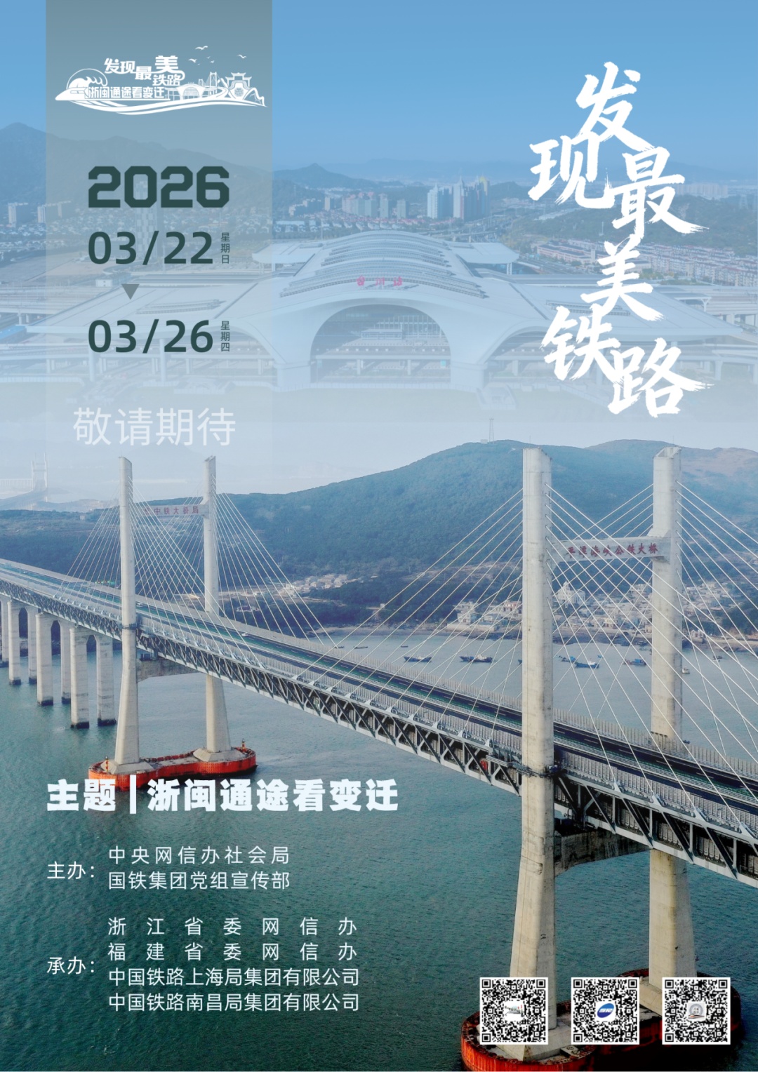 3月22日至3月26日,由中央网信办网络社会工作局、中国国家铁路集团有限公司党组宣传部联合主办,浙江省委网信办、福建省委网信办、中国铁路上海局集团有限公司党委和中国铁路南昌局集团有限公司党委承办的“发现最美铁路·浙闽通途看变迁”网络宣传活动将在杭绍台、杭深铁路沿线举办。