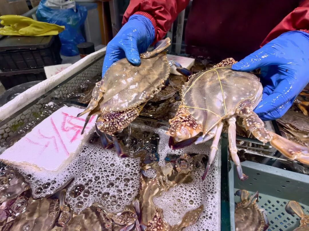 刚上市的刀鱼按条售卖,根据大小不同,价格在30元至100多元不等;带膏皮皮虾售价130元/斤,3—5月正是最佳品尝期;梭子蟹价格跨度较大,每斤45元到200元不等,摊主介绍,5月即将进入禁捕期,后续供应量会有所减少;性价比颇高的珍宝蟹售价160元/斤。