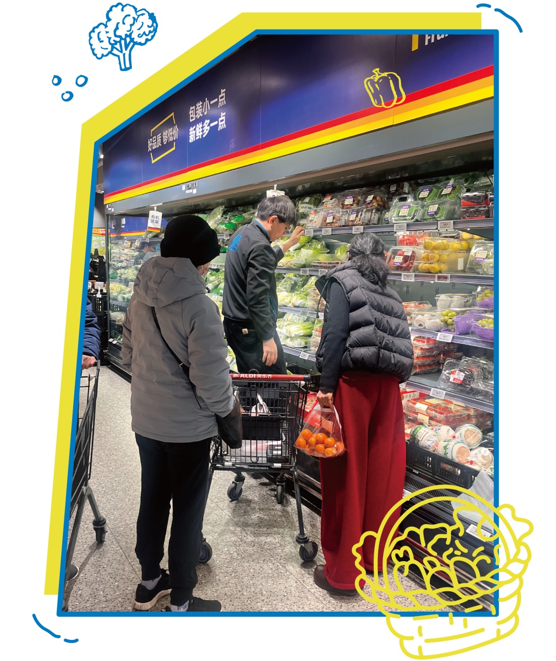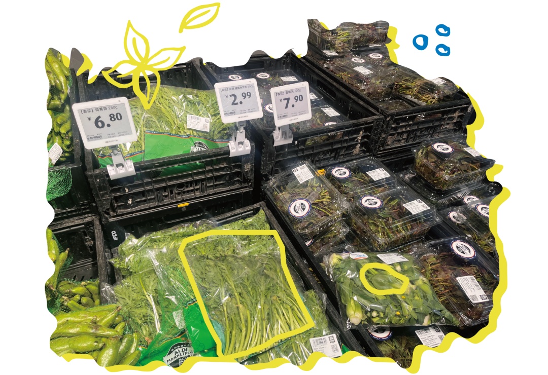 万源坊的奥乐齐门店,早早备好了精选本地春菜。马兰头清苦回甘、含钙量高,凉拌香干是上海人家春日标配;荠菜叶片嫩绿、清甜爽口,钙铁含量出众,包饺子、做馄饨馅再合适不过;被誉为春日“第一鲜”的香椿,红梗绿芽、香气浓郁,富含维C与矿物质,焯水去涩后,便是餐桌必备的时令美味。