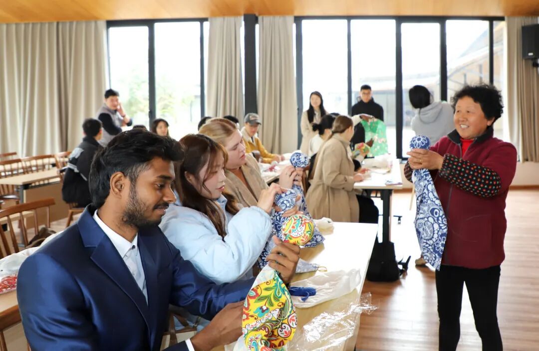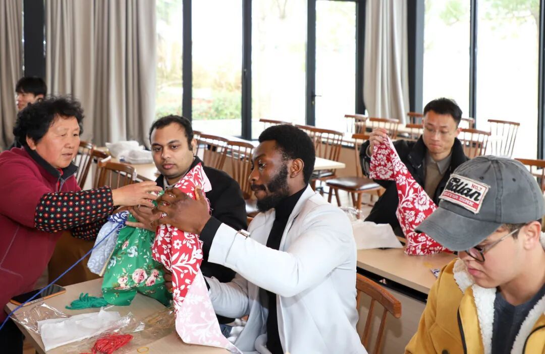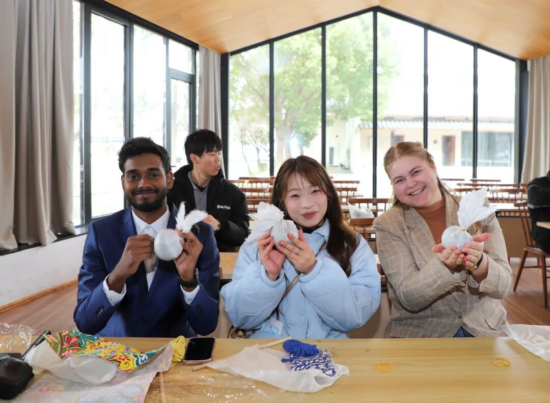 在“在水一方”生态综合体内,留学生们围坐一桌,在金山阿姨的指导下制作艾草锤。填充草药、捆扎成型,一道道工序看似简单,却让人沉浸其中。“很有意思,那位阿姨很热情,也很可爱,我很喜欢这个体验。”留学生Daria说。