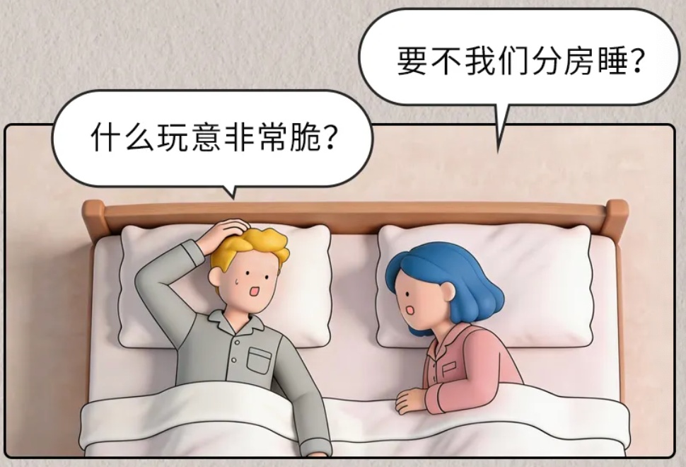 相关研究数据显示,与伴侣不打鼾的人群相比,伴侣打鼾的人群发生入睡困难的风险是1.67倍。被呼噜吵得睡不着的人,不用说,睡眠减少能造成的伤害都中招了——