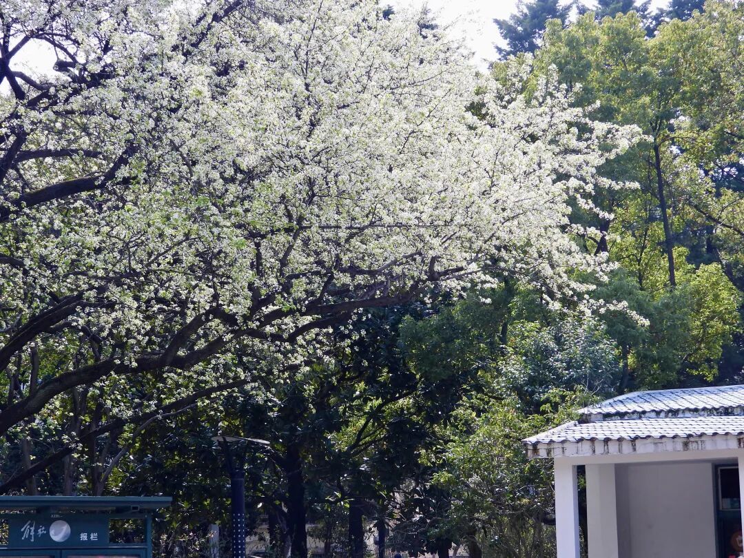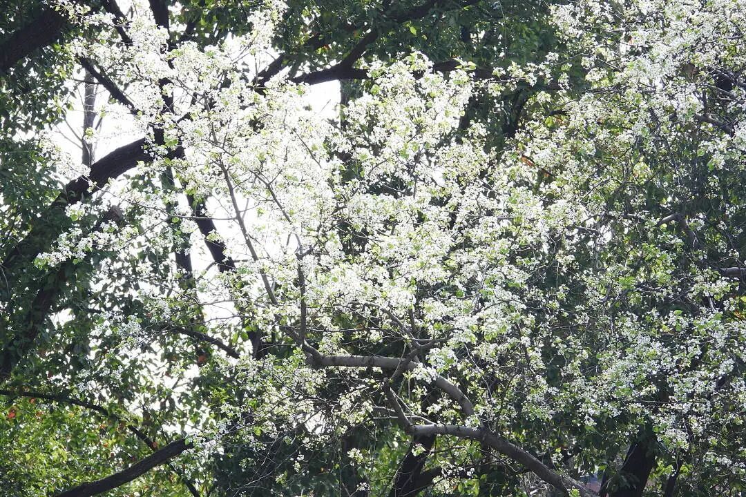 记者观察到,今年花开呈现的造型格外精致。枝干向四面舒展,撑起一片近十米高的伞状树冠,细密的白花缀满每一根枝条,远望如浮云停驻,近看则似碎玉堆叠。