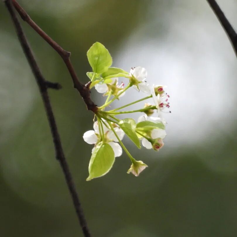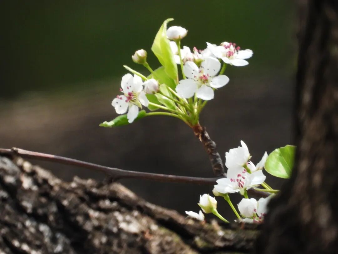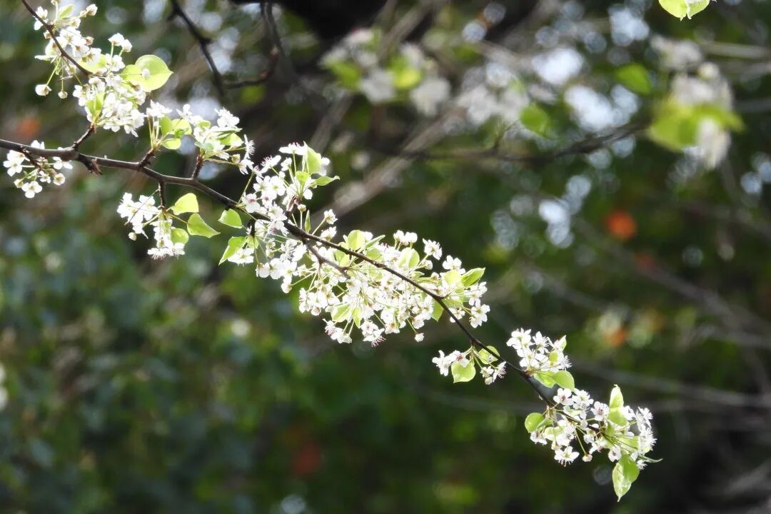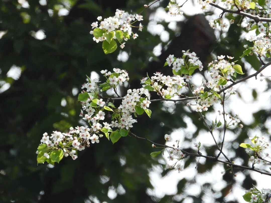 杜梨花瓣小巧,簇拥成团,在晌午的光线里透着薄薄的亮度。风拂过时,花枝轻摇,碎瓣纷落,树下便落起一阵无声的“春雪”。