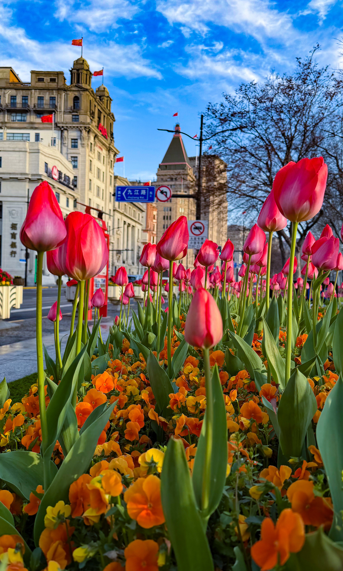 春风一到,外滩的郁金香就开了,像是和百年建筑约好了一起盛放。中山东一路,西边是沉淀了岁月的万国建筑群,灰石砖墙藏着百年故事;东边是陆家嘴“三件套”,勾勒着现代都市的天际线。