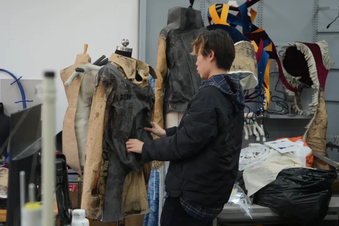 “在设计过程中,我与印花设计、雕刻设计的同学进行了深入讨论,不断尝试,才最终完成这套作品。”沈逸飞指着即将完工的系列服装回忆道这次跨专业的交流经历,让他深刻意识到单一专业的局限性,“我希望未来能够进行跨专业学习,不断尝试突破。也希望学院能加强这方面的机制建设,让不同专业的学生更容易碰撞出创意的火花。”