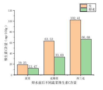 由于在轻食中上述部分食材常需焯水后食用,实验又选取菠菜、花椰菜、西兰花3种蔬菜,检测焯水5分钟前后的维C含量变化,结果如下:
