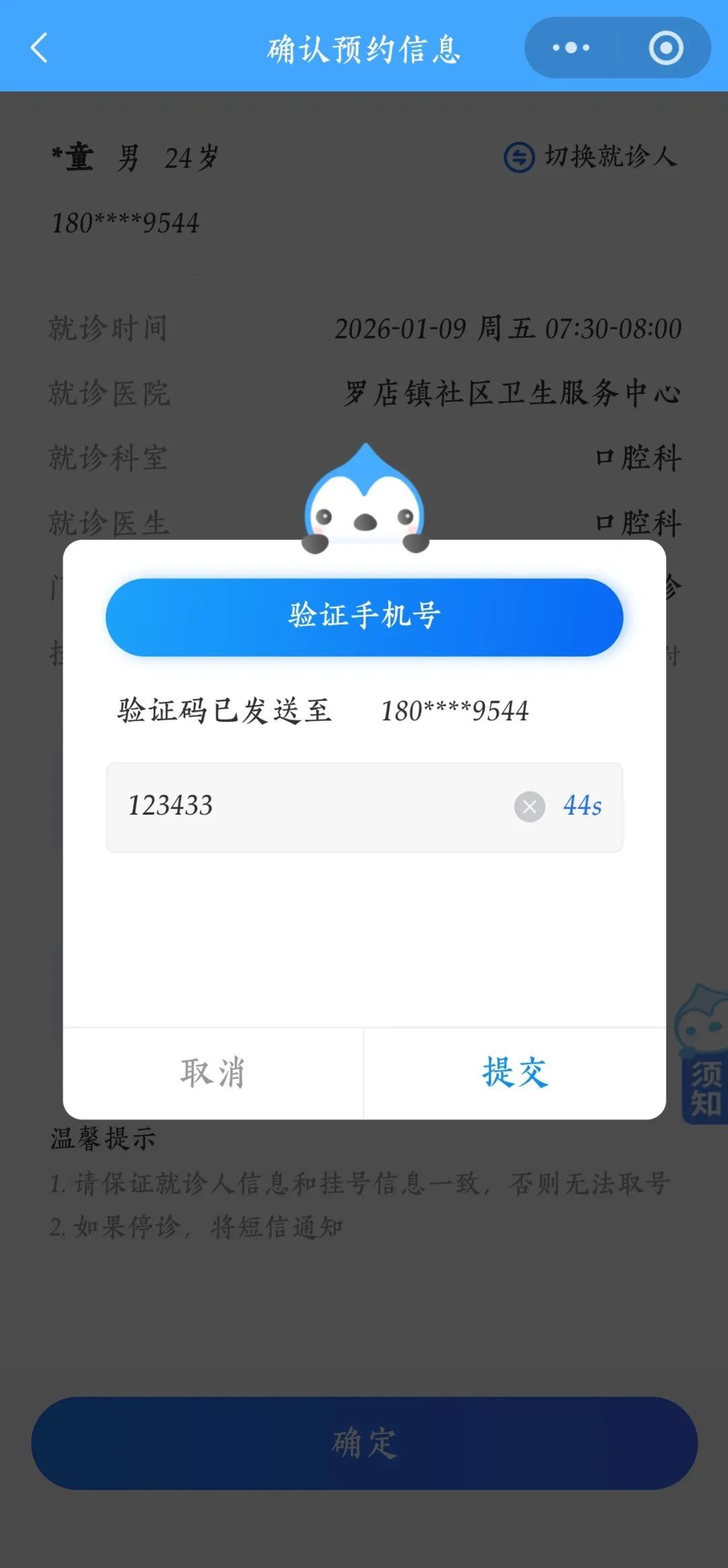 仔细核对预约日期、科室、医生和时间,确认无误后提交订单接收并填写短信验证码