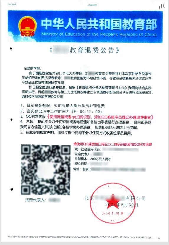 2023年7月,邱先生收到一件陌生快递,内有一份某教育培训机构的退费公告。公告上不仅印有“中华人民共和国教育部”字样,还详细列出了该机构的统一社会信用代码、法定代表人、地址等信息,并加盖了“公章”,看起来颇为正式。