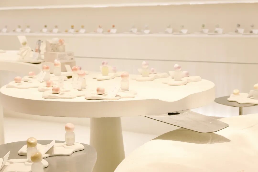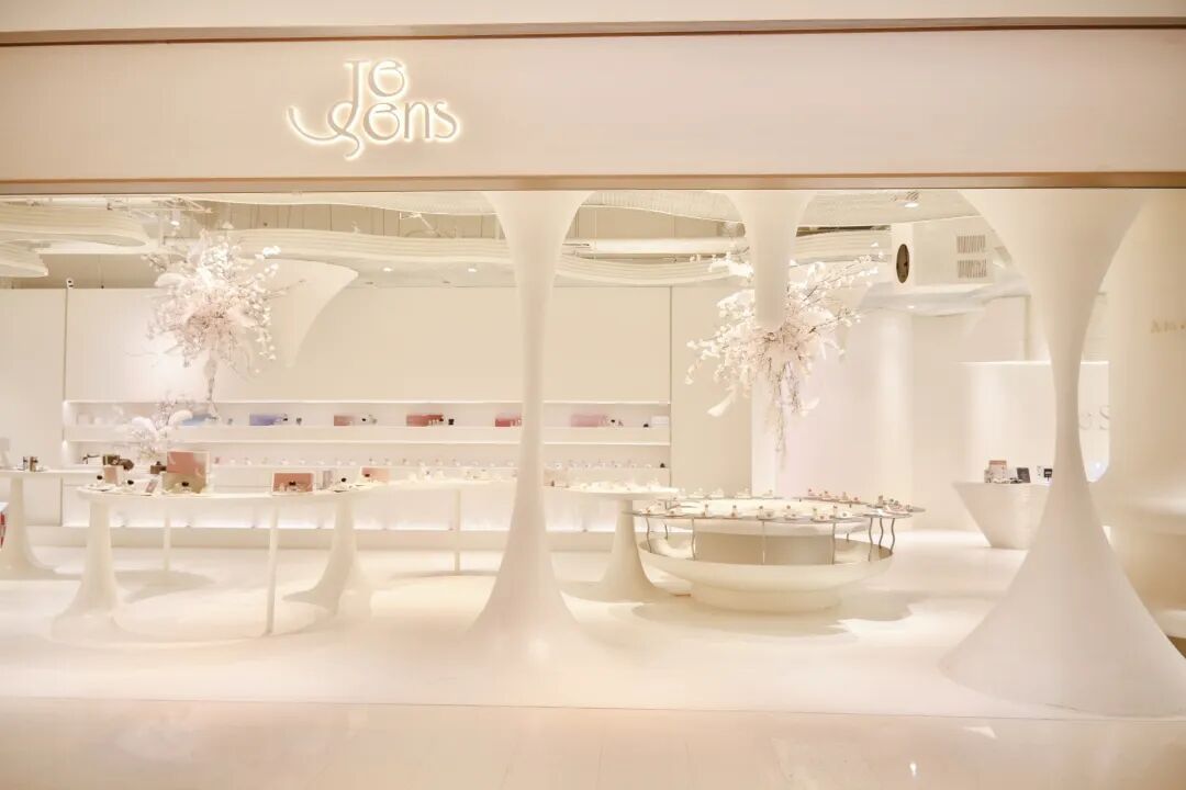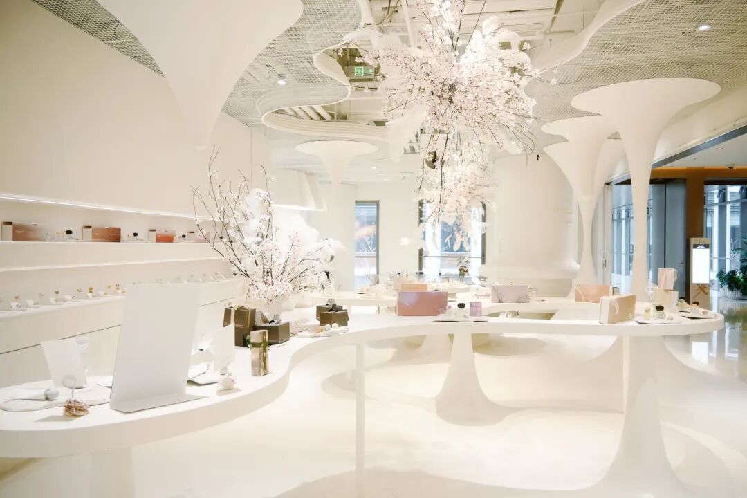 店铺以白色石钟乳溶洞为设计灵感,蜿蜒的柱台像从地底长出来的石笋,灯光藏在岩隙之间,像月光洒在地下秘境,让人想起喀斯特地貌下的地下河床。置身其间,仿若探寻岩息漫迹,去触碰万物气息的本源。