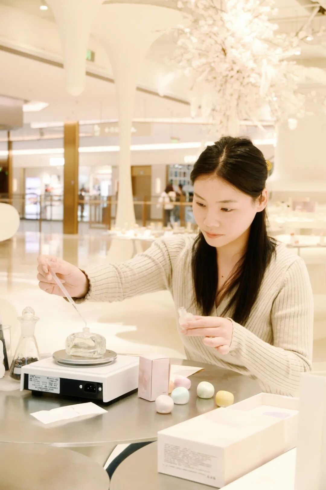 店里的试香区是一排蜿蜒曲直的石柱台,花香、木质香、柑橘&茶香、动物皮革、东方调、绿叶调、水生调、美食&酒调、果香、馥奇西普调……十余种香型近百瓶香氛精油一一陈列。正巧三位白领入店试香,各有偏爱,十分鲜活。第一位小姐姐拿着柑橘的试香纸轻嗅:“味道很清爽,柑橘的脆感混着淡淡的茶香,夏天喷肯定很解腻,像咬了一口刚剥开的青提。”旁边的小姐姐,轻攥着木质香的试香石:“这个味道太治愈了,雪松的沉稳裹着一点琥珀的温润,没有刺鼻的厚重感,像被自然轻轻裹住。”不远处穿粉色卫衣的小姐姐试的是水生调,深吸一口后眼睛发亮:“就是这个感觉!像雨后刚放晴的海边,瞬间就不闷了,连呼吸都变轻盈了。”