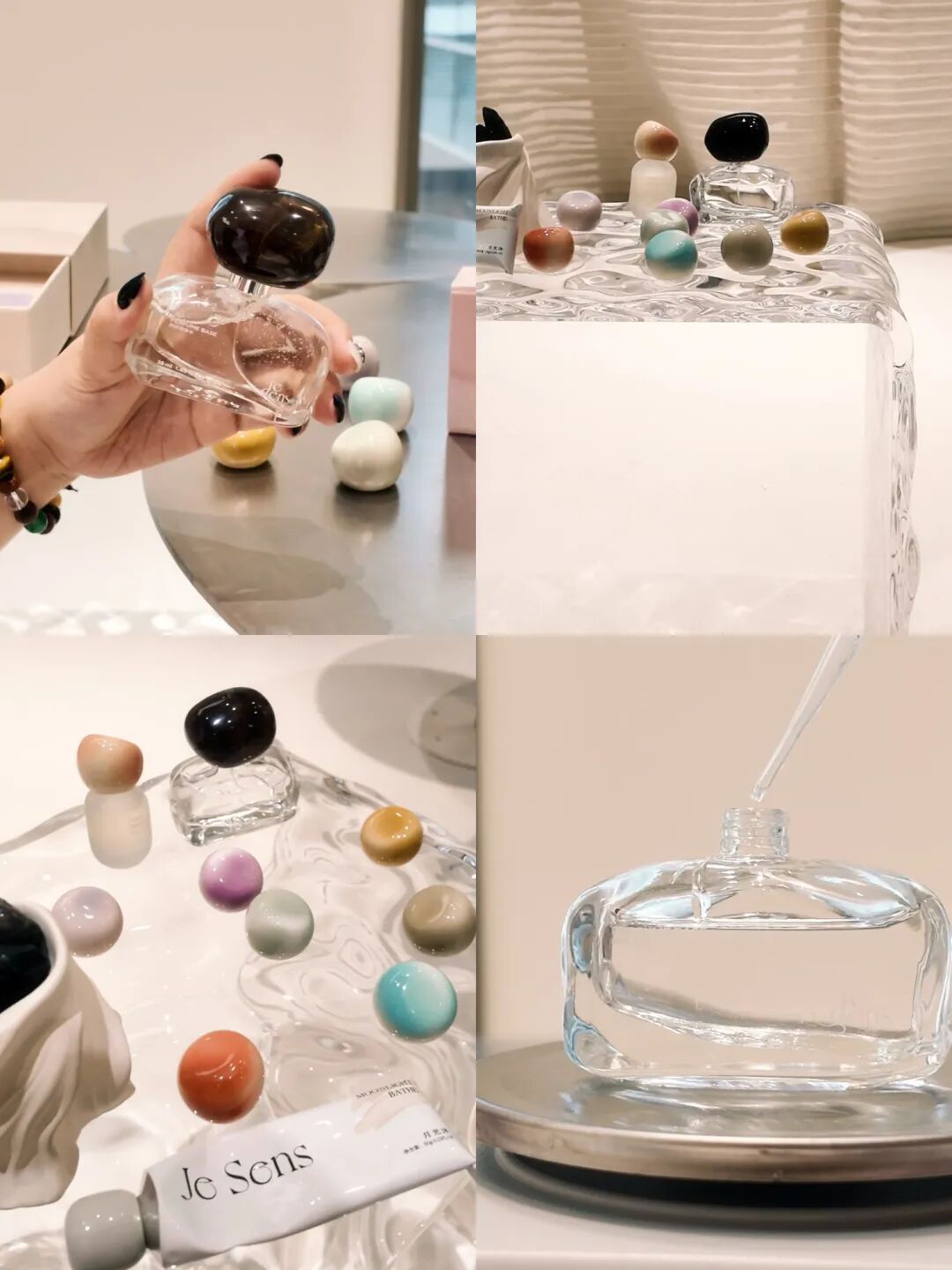 驻足欣赏时,主理人笑着走了过来,一身简约穿搭,气质温和,谈起品牌理念时眼里藏着光。“Je Sens觉森,法语意为‘我闻到我感觉到’,它是一种内心纯粹的平衡状态。我们不想做流水线的香水,想让每个人都能找到属于自己的气味,这也是品牌‘自由、内观’的核心。”说话间,她递来试香纸。主理人说,Je Sens的灵感全都来自自然,她希望通过这些香气,让人们在快节奏的都市里,能有片刻静下心来,与自己对话,“气味自由不是随便混搭,是找到内心的平衡,就像溶洞里的岩息,看似沉寂,却藏着最本真的自然力量。”