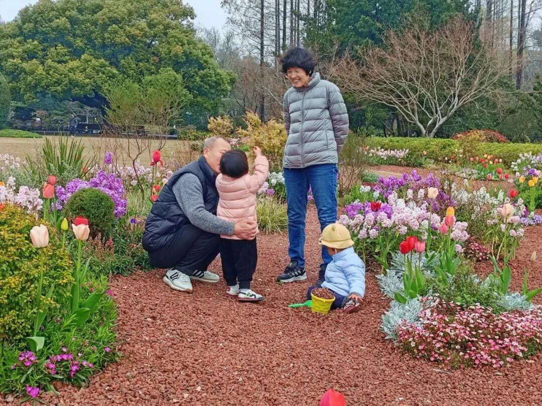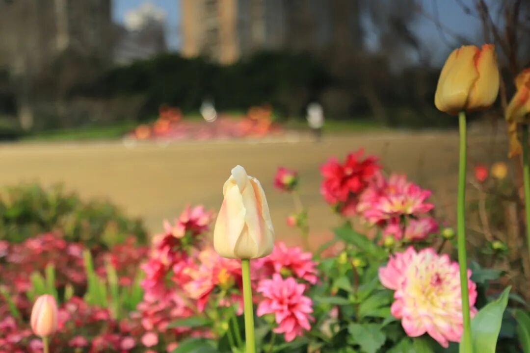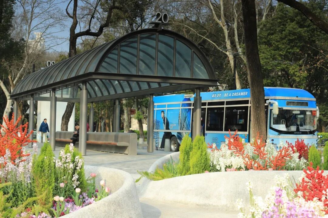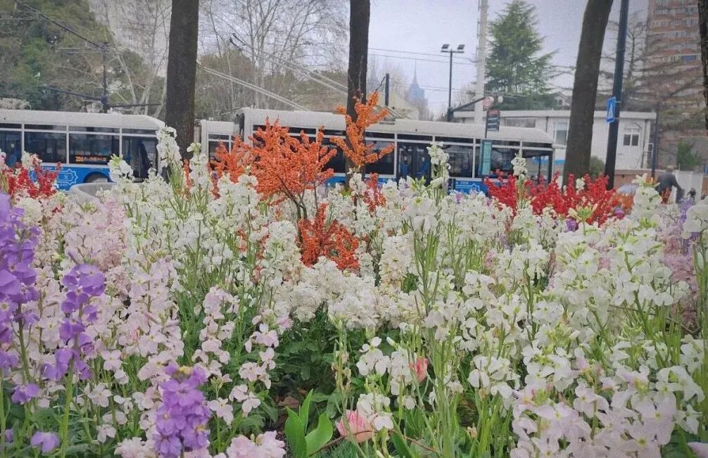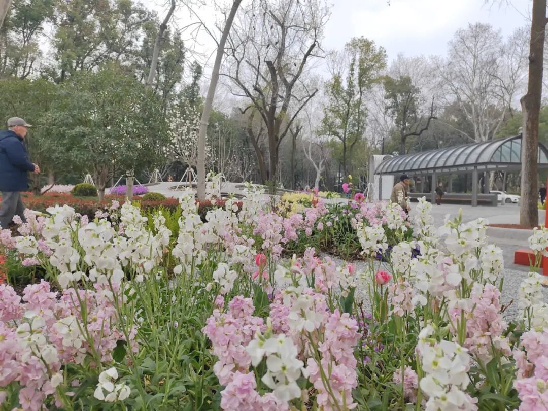 春光不止于此。在中山公园2号门附近的种子池花坛,盛放的紫罗兰与郁金香相映成趣,搭配复古白木门与穿行的百年公交,构成一幅充满文艺气息的春日图景。过往行人纷纷驻足,走进花丛,与春色同框。