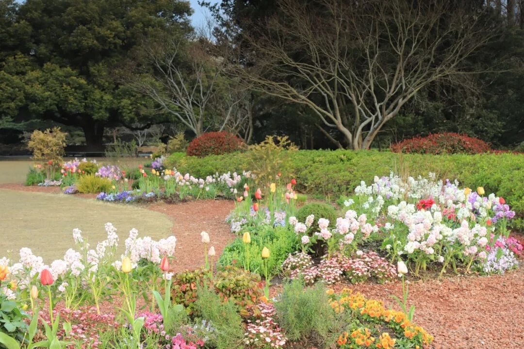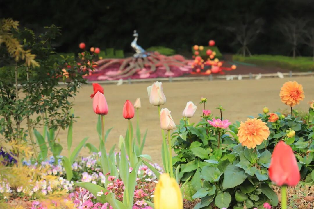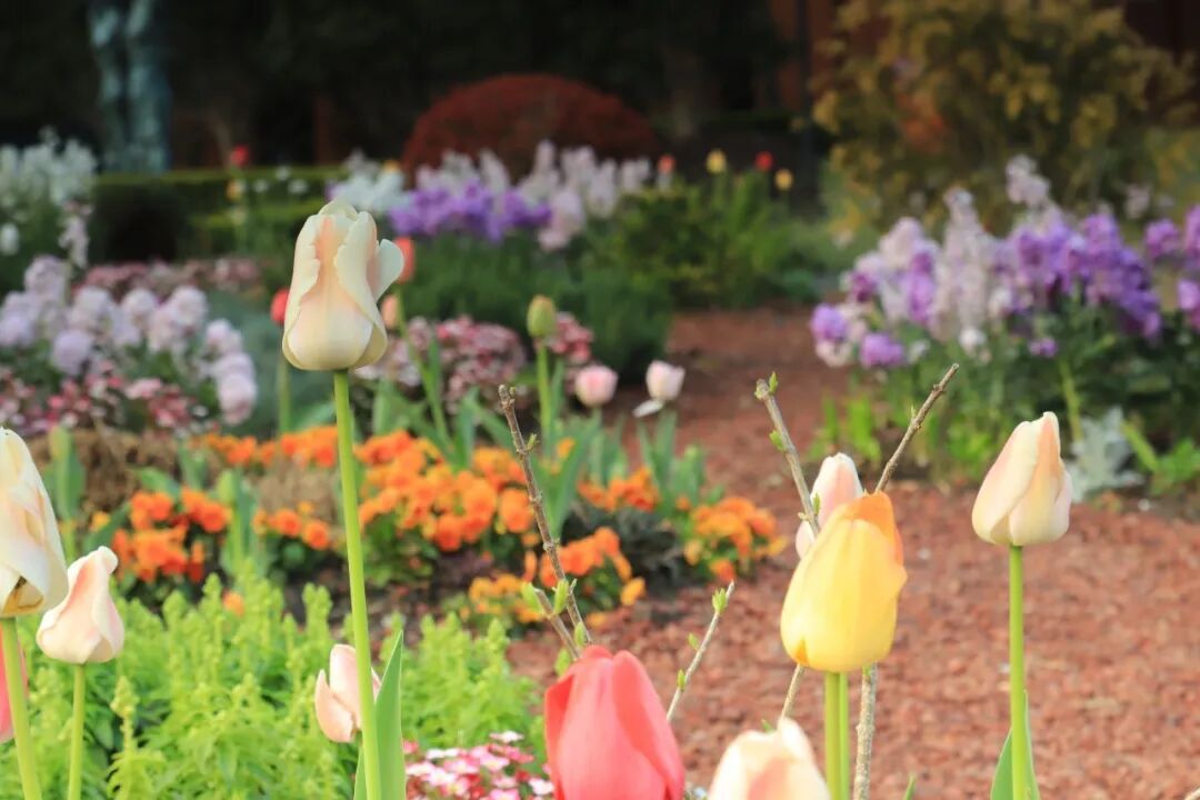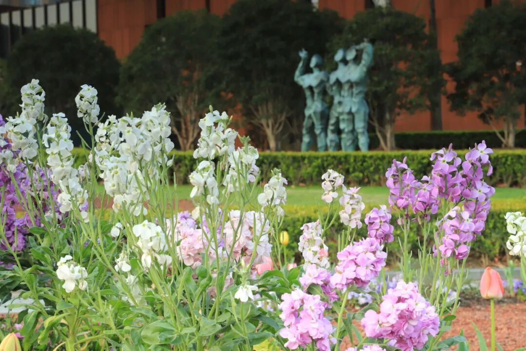 春光不止于此。在中山公园2号门附近的种子池花坛,盛放的紫罗兰与郁金香相映成趣,搭配复古白木门与穿行的百年公交,构成一幅充满文艺气息的春日图景。过往行人纷纷驻足,走进花丛,与春色同框。