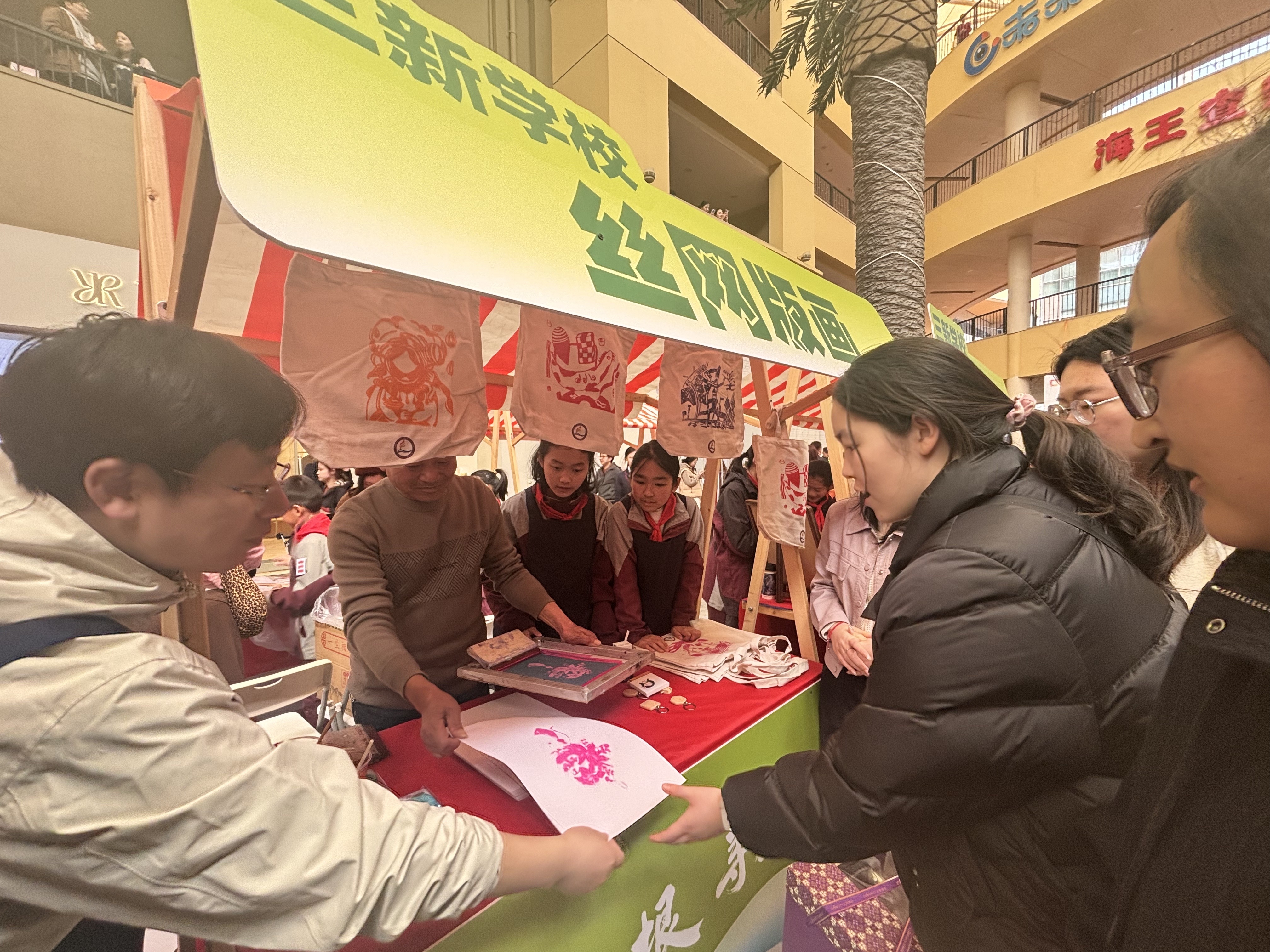 除了静态展示,各社团还以互动体验的方式拉近与市民的距离。在三新学校的丝网版画展位,市民在孩子们的指导下,将墨色缓缓推过刻版,感受了一番传统版画的独特魅力。“以前只能在教室里做版画,今天能来到大商场向大家介绍,我觉得特别自豪!”一名社团成员兴奋地表示。东华附校花间寻味社团则带来了用天然皂角制成的洗手液和肥皂,闻起来散发着淡淡的草木清香。据社团老师介绍,其中的原材料无患子是学生在学校里捡的,前两天刚刚完成制作。这份来自校园的天然礼物,让市民们在体验中感受到了孩子们对自然的珍视与用心。