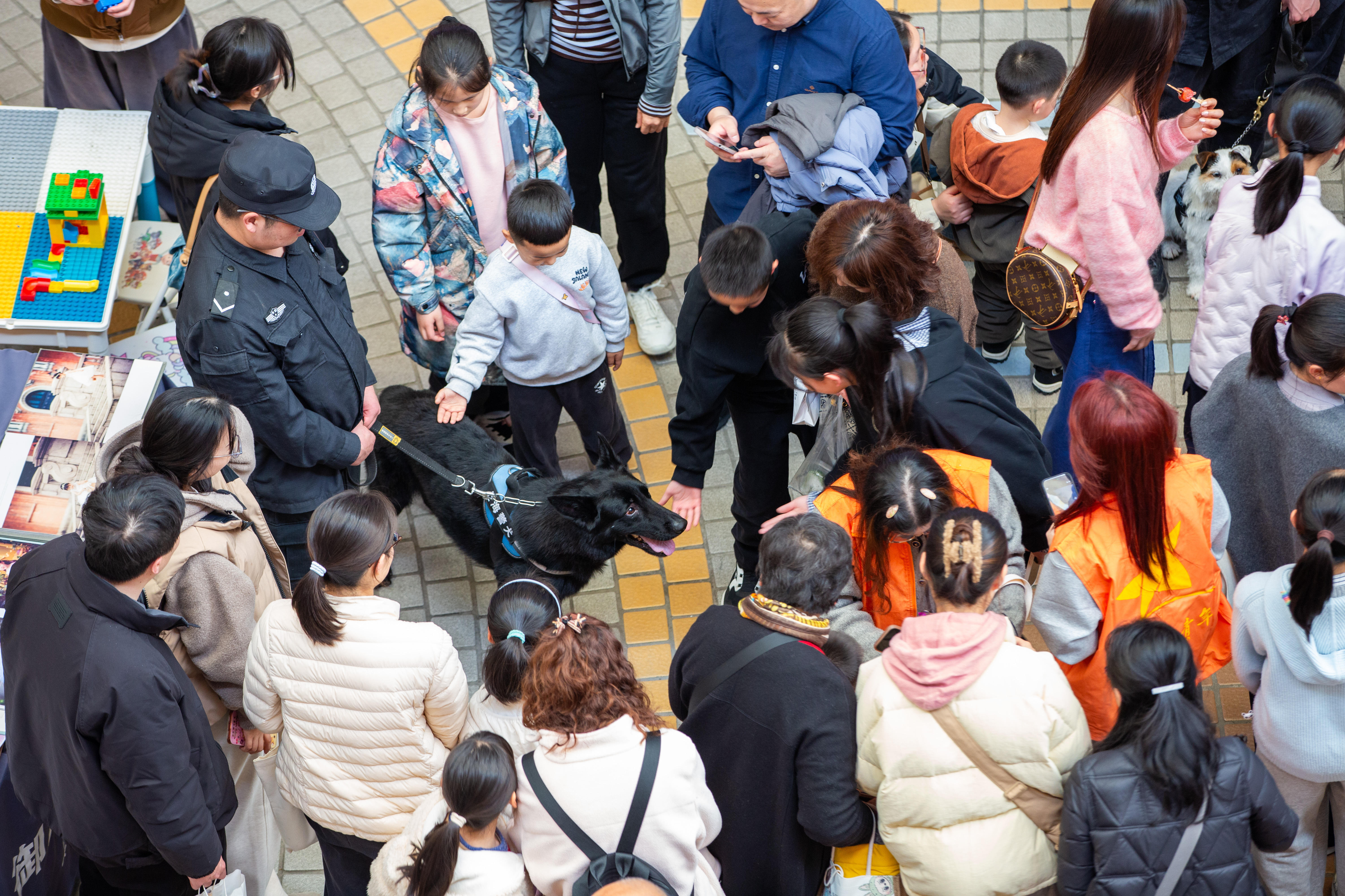 下午2时30分,由区公安分局带来的警犬展示互动区引起市民围观。专业警犬在训导员的指令下精准完成各项动作,威风凛凛又憨态可掬。小朋友们勇敢上前,与警犬近距离接触,现场欢呼声此起彼伏。“第一次这么近看警犬,又帅又可爱!”一名小朋友兴奋地说道。