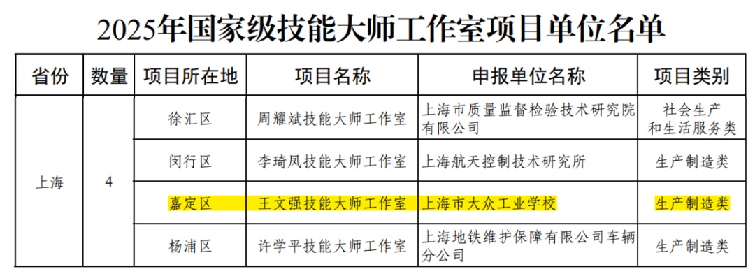 近日,国家高技能人才培养领域传来喜讯。根据人力资源社会保障部办公厅、财政部办公厅联合发布的《关于公布2025年国家级高技能人才培训基地和技能大师工作室项目单位备案名单的通知》,上海市大众工业学校申报的“王文强技能大师工作室”,成功入选2025年国家级技能大师工作室项目单位名单(生产制造类)。