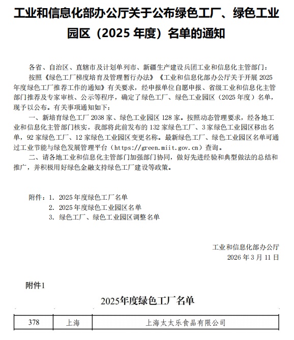 在国家“双碳”战略背景下,绿色制造正成为推动工业经济高质量发展的重要引擎。近日,国家工信部公布绿色工厂、绿色工业园区(2025年)名单,位于江桥镇的上海太太乐食品有限公司成功获评国家级“绿色工厂”。