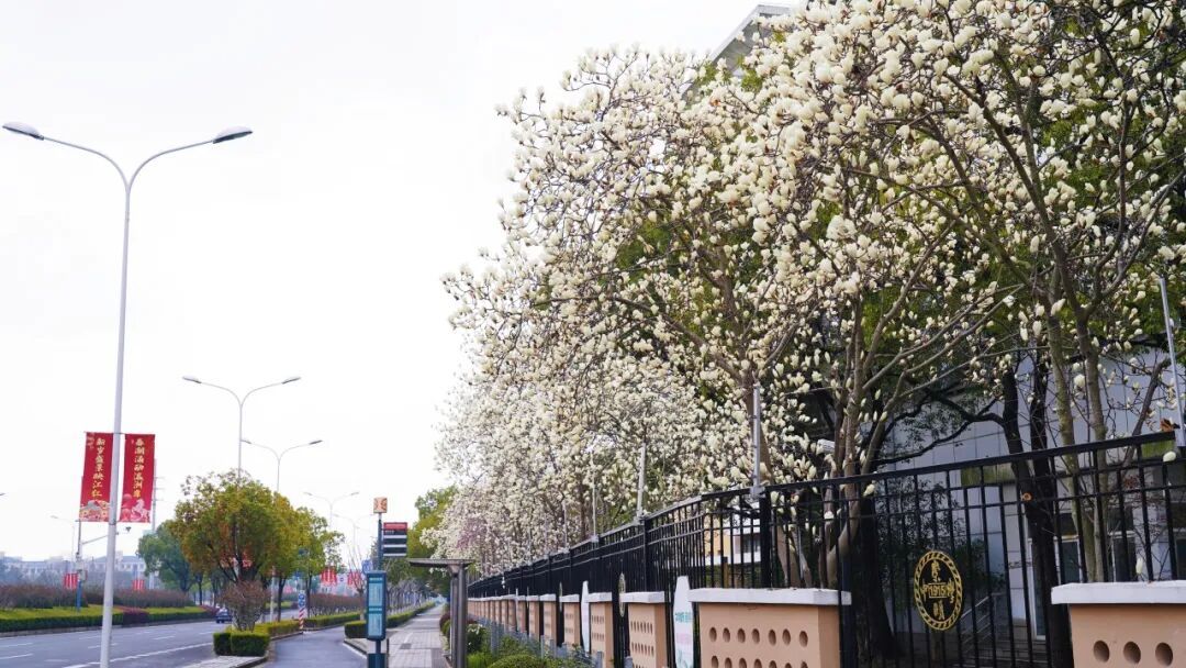 2、乔松路(鼓浪屿路-佘山岛路段)(免费,30分钟,骑行约8分钟):1100米特色绿道,隔离带满植白玉兰、二乔玉兰。道路开阔,侧逆光拍花树与街景超好看。