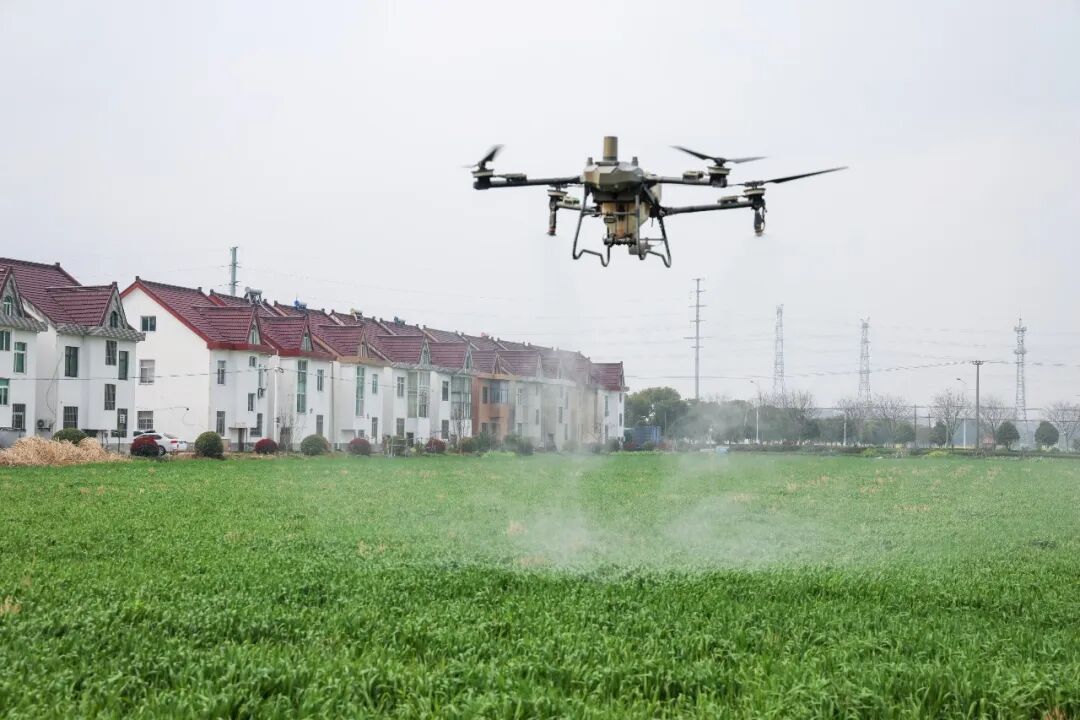 今天(3月23日)清晨,在朱泾镇的麦田里,农户老孙正操作无人机进行飞防作业。为应对清明前后可能出现的多雨天气,合作社已提前疏通并加宽了田间排水沟,同时结合此次飞防增施了叶面肥,促进麦苗由弱转壮。