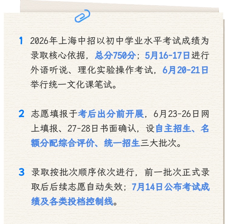 据市教育考试院介绍,根据《上海市教育委员会关于印发<上海市初中学业水平考试实施办法>的通知》(沪教委规〔2023〕5号)、《上海市教育委员会关于2026年上海市高中阶段学校招生工作的若干意见》(沪教委基〔2026〕2号,以下简称《若干意见》)等,现就2026年上海市高中阶段学校考试招生工作提出如下要求。