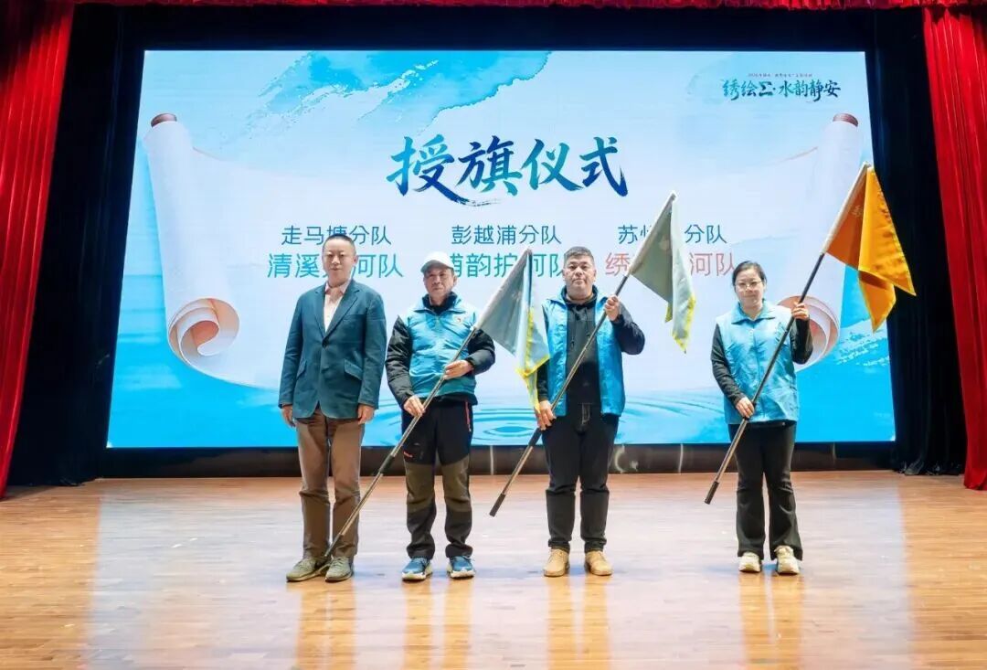 活动现场,静安区建设管理工作党委书记洪海明为三支新组建的Σ绣带清清护河志愿队伍授旗——蓝色、绿色、金色,分别象征着碧水长流、生态廊道、金色水岸。三支队伍汇聚成“Σ绣带”最温暖、最坚实的守护力量。