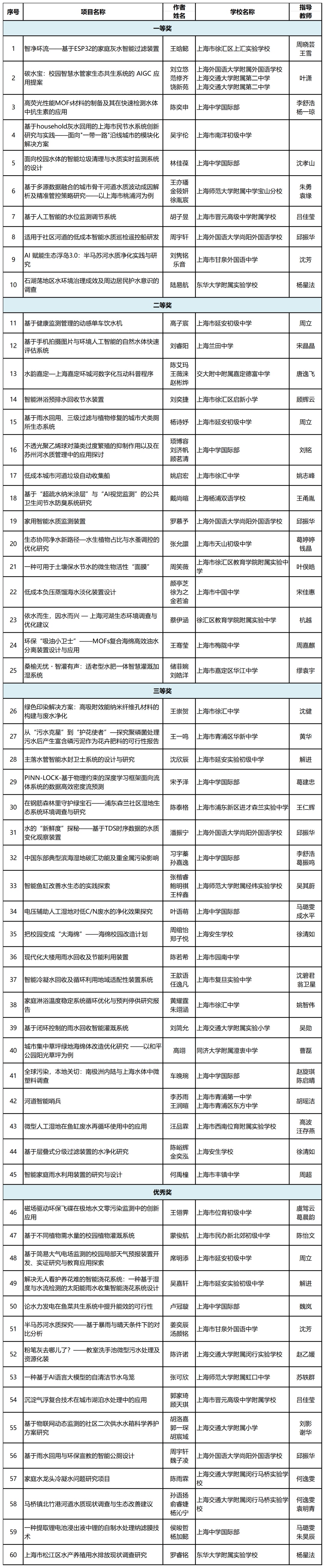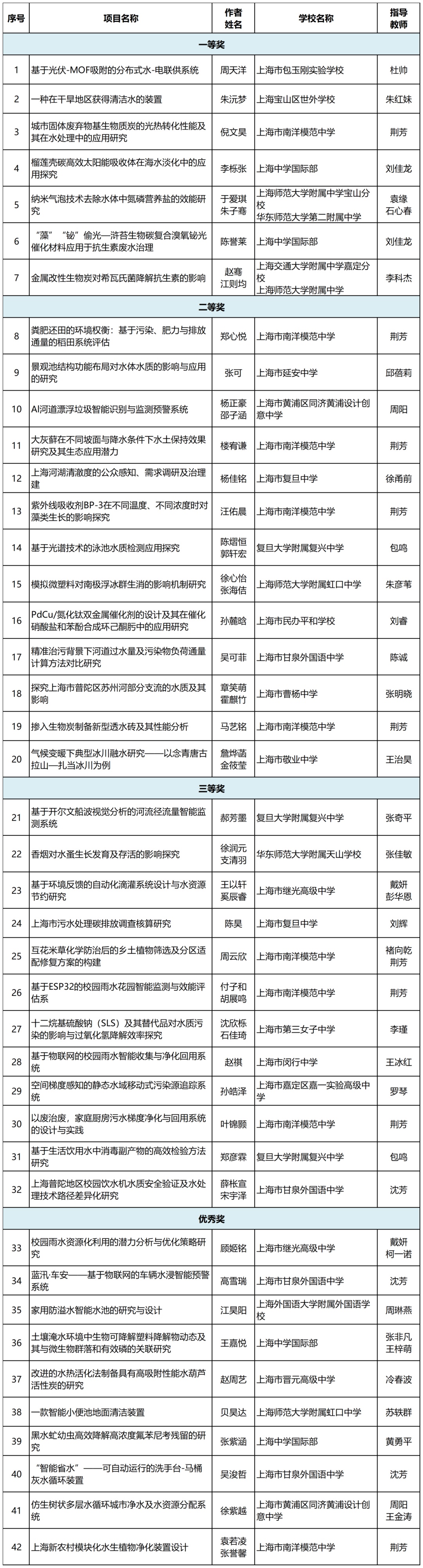 由上海市环境保护宣传教育中心、中国福利会少年宫联合组织开展的第二十三届全国中学生水科技发明比赛上海赛区初赛活动,得到了各区生态环境、教育等部门的大力支持。经评审,共评选出高中组获奖作品42个、初中组获奖作品60个,现予以公示。