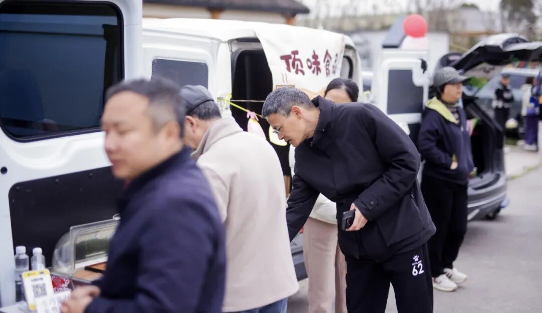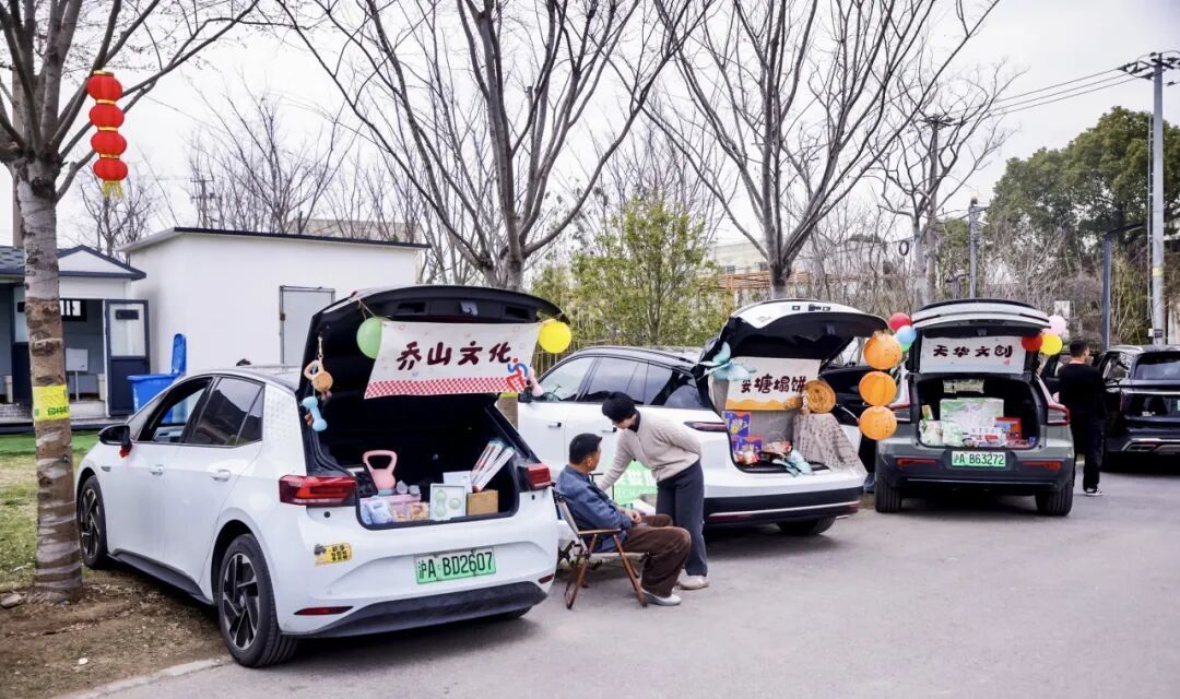 活动现场,最吸引眼球的当数汽车后备厢集市。十余辆精心布置的汽车整齐排列,后备厢摇身一变成为创意摊位:娄塘塌饼、灯塔草莓、明谦咖啡、真仁堂茶饮、顶味食品、阿咪食品等本地特色美食琳琅满目;沥江生态园、馥桂萌宠园、乔山文化、江南闺秀画、天华文创等文旅产品也悉数亮相。游客们穿梭其间,或品尝美食,或挑选心仪好物,欢声笑语不断。