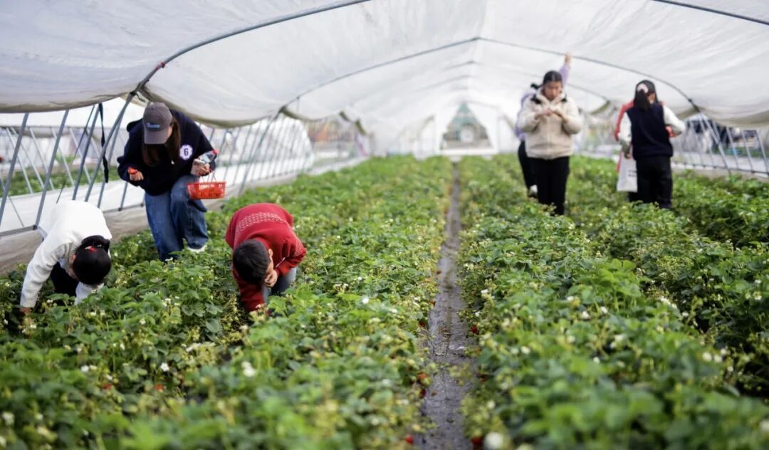 在亲子趣味打卡区,40组家庭参与其中,孩子们在家长的陪伴下完成各项趣味任务,集齐印章换取草莓采摘券。灯塔村的草莓采摘大棚里,浓郁的草莓香气扑面而来,孩子和家长提着篮子,小心翼翼穿梭在草莓垄间,挑选着成熟的果实,感受亲手采摘的乐趣。