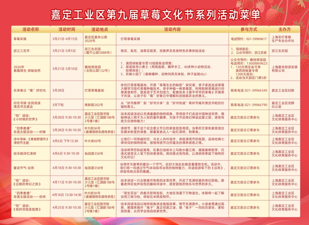 本届草莓文化节作为上海乡村春游季及上海汽车文化节街镇系列活动之一,将持续至5月5日。市民可以前往灯塔草莓基地、沥江生态园、馥桂萌宠园等地参加系列农文商旅活动,也可以参与“悦”读绘等阅读推广、“四季娄塘”等非遗主题活动。值得一提的是,嘉定工业区还整合了辖区酒店、乡村旅游等各类资源,参与嘉定区票根权益活动,为市民提供更丰富的游玩体验。