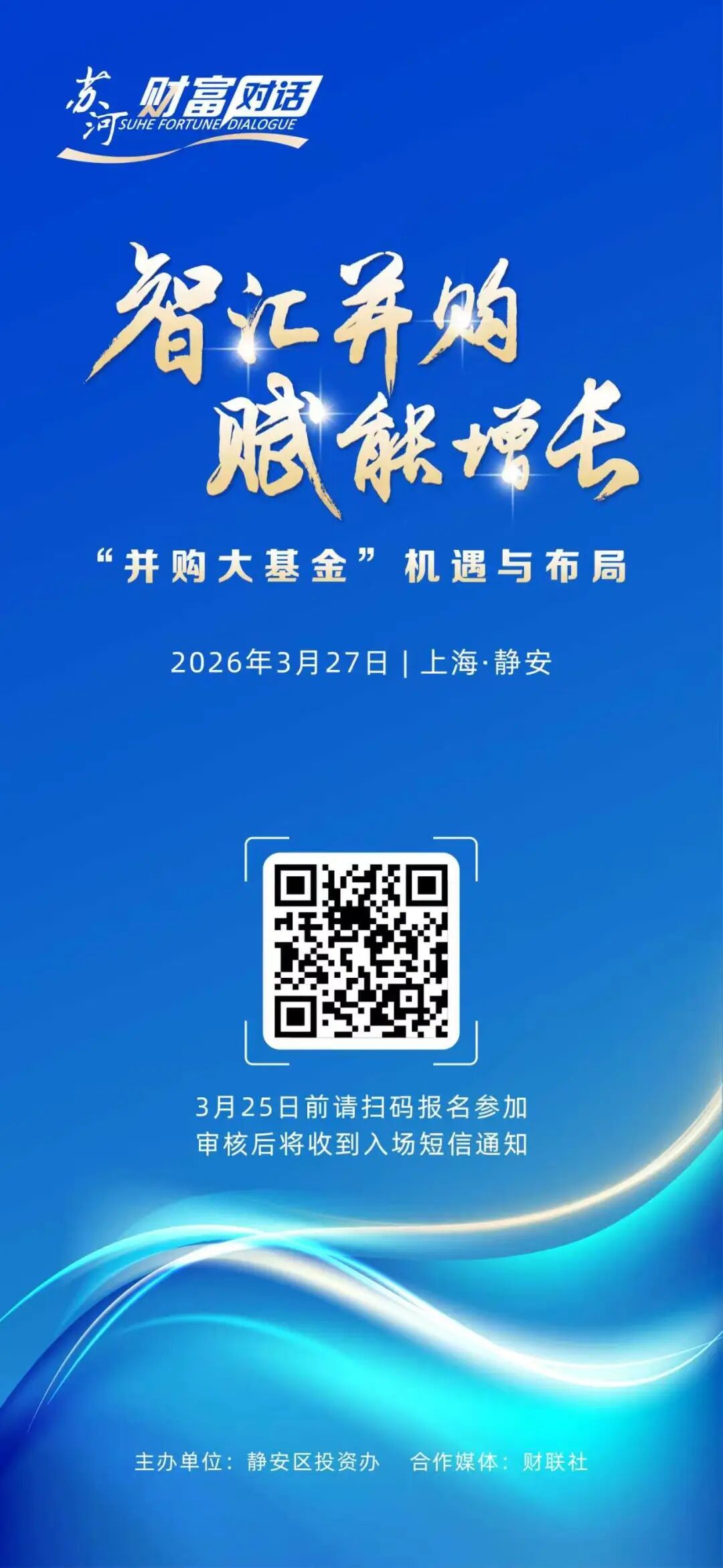 在此背景下,由静安区投资办主办的2026年苏河湾财富对话首场活动,将于3月27日在静安区举办。本次活动以“智汇并购 赋能增长——‘并购大基金’机遇与布局”为核心主题,特邀知名投资机构、上市公司、并购专业服务机构的行业专家齐聚一堂,深度探讨当下开展高质量并购、以并购重组赋能实体经济发展的具体路径与实践方向。