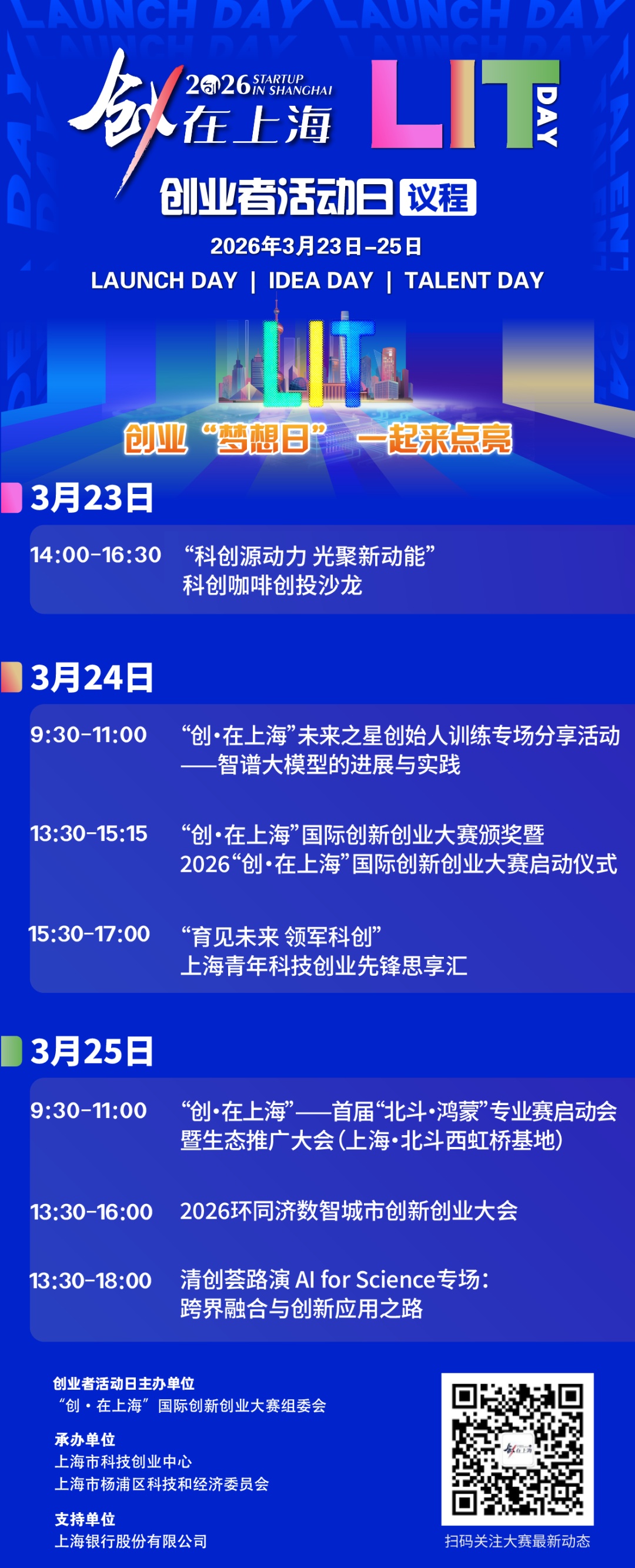 黄浦江上的复兴岛,巨型塔吊与艺术装置交相辉映,工业遗存与未来科技在此完成时空对话。3月23日至25日,“创·在上海”LIT DAY创业者活动日将在这里举行。“LIT”取“Light”之意,既象征“点亮创业之梦”,更蕴含“Launch Day(成果发布日)、Idea Day(创意碰撞日)、Talent Day(人才集聚日)”的三重深意。