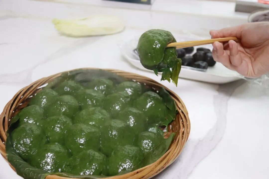 随后,裴阿姨将菜叶和温水、糯米粉按照比例倒在一起,揉成面团。揪一小块面团,放入一勺自制的豆沙馅,慢慢收口揉匀,一个个圆滚滚、青绿色的青团就做好了。蒸制十分钟,软糯的青团冒着热气出锅。咬上一口,外皮软糯不粘牙,细腻的豆沙馅带着淡淡的桂花甜香,甜而不腻,满口清香。