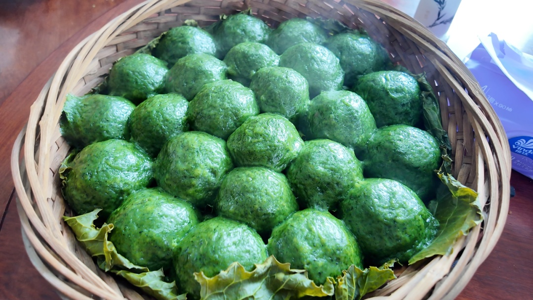 泥胡菜又称“石灰菜”,是制作本地青团的最佳原料,比起艾草的浓郁香气,泥胡菜的味道更显清新质朴。泥胡菜焯水后,加入石灰水煮至糊状,反复揉搓冲洗。这样既能去除苦涩,又让青团色泽墨绿鲜亮。