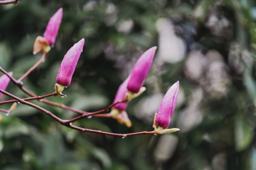 其中紫玉兰更显风骨,于早春微凉的风雨里悄然绽放,先花后叶的生长姿态,恰是不畏艰难、迎光新生的顽强生命力的最好诠释,在枝头书写着春日的奋进与希望。细雨打在紫玉兰的花瓣上,未减其半分风骨,反倒让那一抹紫愈发温润,如同思念虽柔,却始终扎根心底,在时光里生生不息。