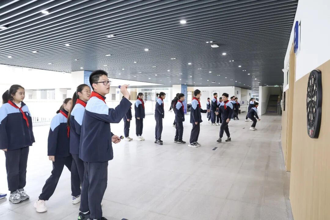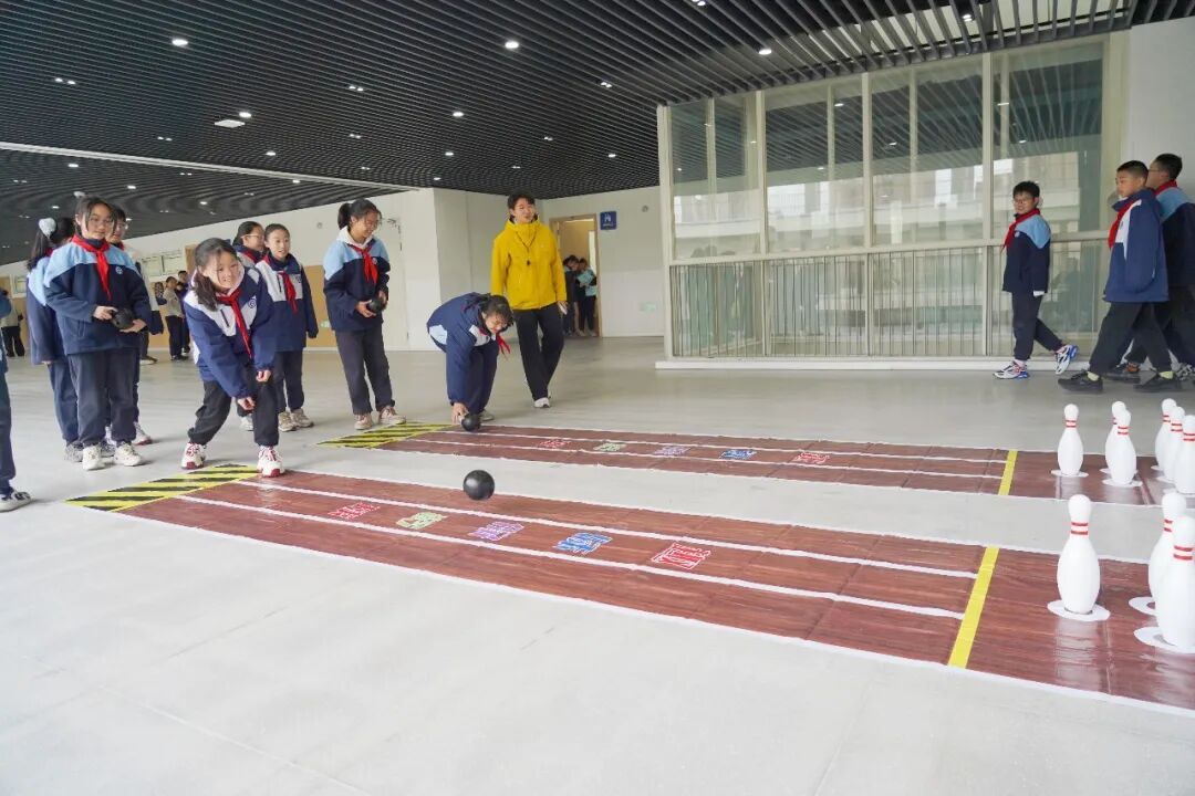 在课间运动项目的设计中,学校还广泛听取大队委员及学生意见,增设了女生喜爱的保龄球、科技感十足的电子飞镖等项目,还打造了懒人沙发休息区,实现动静结合;校园内教室、走廊、操场、体育馆全空间开放,教室配备运动器械,让学生“随时能运动,随处可放松”,更好构建“愿出来、乐参与、动起来”的课间生态。