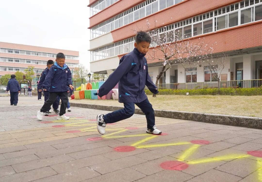 同样作为嘉定区试点校,上海大学附属嘉定实验学校将“健康第一”的教育理念融入课间设计,让5分钟的延长时间释放出大能量。在该校,课间不再是简单的休息,而是根据不同学段特点量身打造的运动时光。