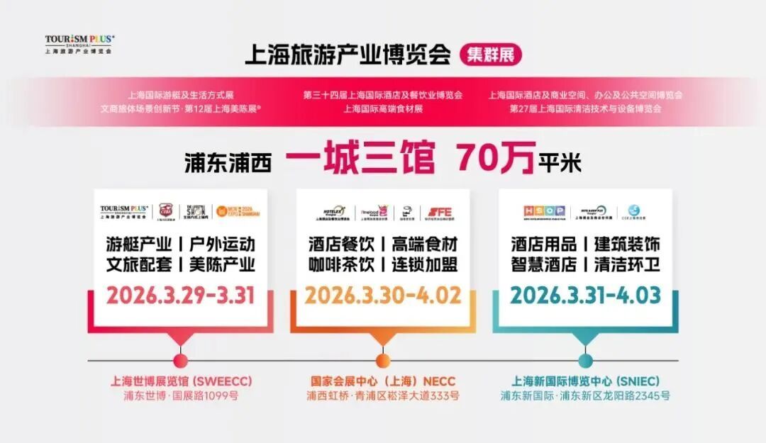 据市文化旅游局介绍,2026年3月29日-4月3日,2026上海旅游产业博览会将以五个集群展的形式,在上海世博展览馆、国家会展中心(上海)、上海新国际博览中心三大展馆依次开展。总展出面积将达70万平方米,覆盖16大产业类别,58大展览板块,汇聚6000多家展商的10万余款新品;展会同期还将举办论坛、配对会、赛事、走秀、生活方式节等丰富多彩的活动300余场。
