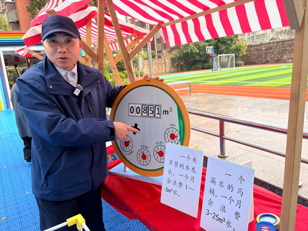同时,他还准备了一个可互动的水表模型:“学校‘啄木鸟校园护水小队’的同学们通过抄录校园内所有水表,监测月度用水量。那么水表上的数字表示什么呢?通过这个大水表,大家就都能明白啦。”
