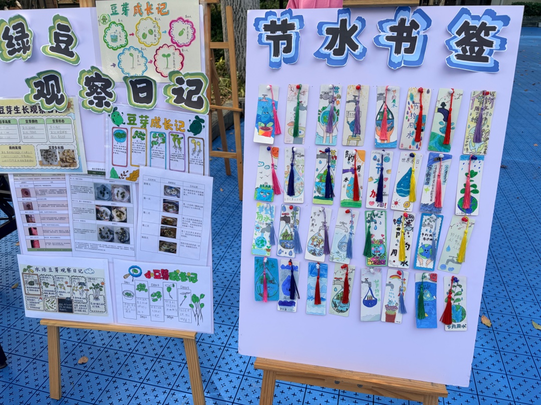 连学校的老师都感慨,世界水日的系列活动每年都在办,一年比一年办得更丰富、更热闹。今年,“交大—江川”学区的老师和同学代表们也来了,不同校服的孩子们聚在一起,对邵老师指导学生做的海报、装置、翻翻书仔细看着,赞叹不已。