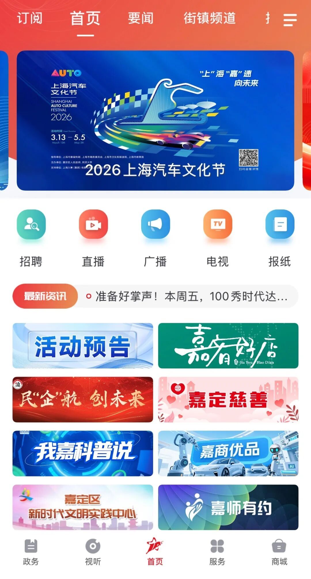 在“上海嘉定”APP首页中,点击“直播”按钮,可以回看“健康有道”往期节目。