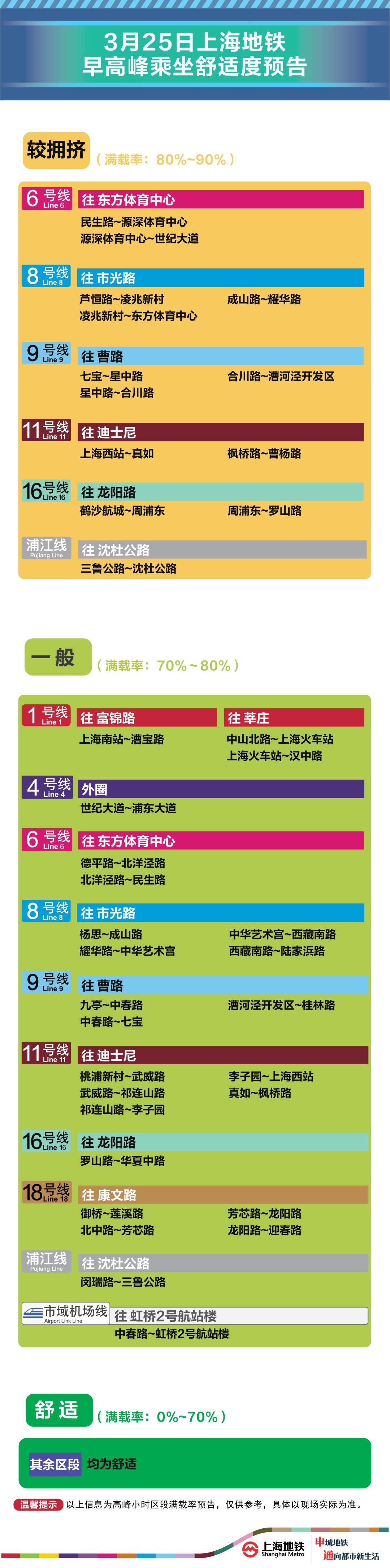 为提升上海地铁早高峰期间出行服务水平,提升乘客乘坐体验,上海地铁向乘客提供乘坐舒适度预告,方便乘客提
