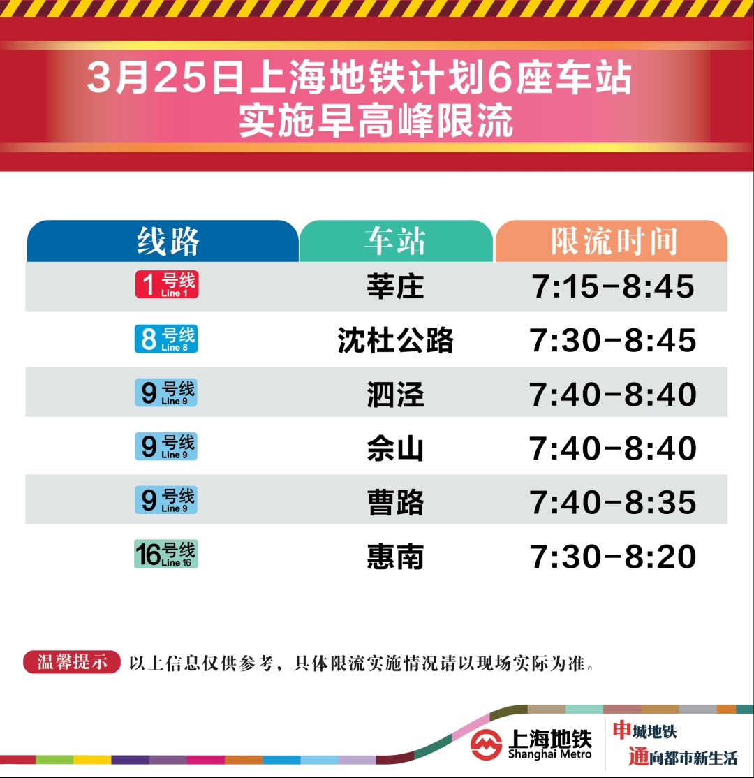 3月25日早高峰莘庄、沈杜公路等6座地铁站计划限流