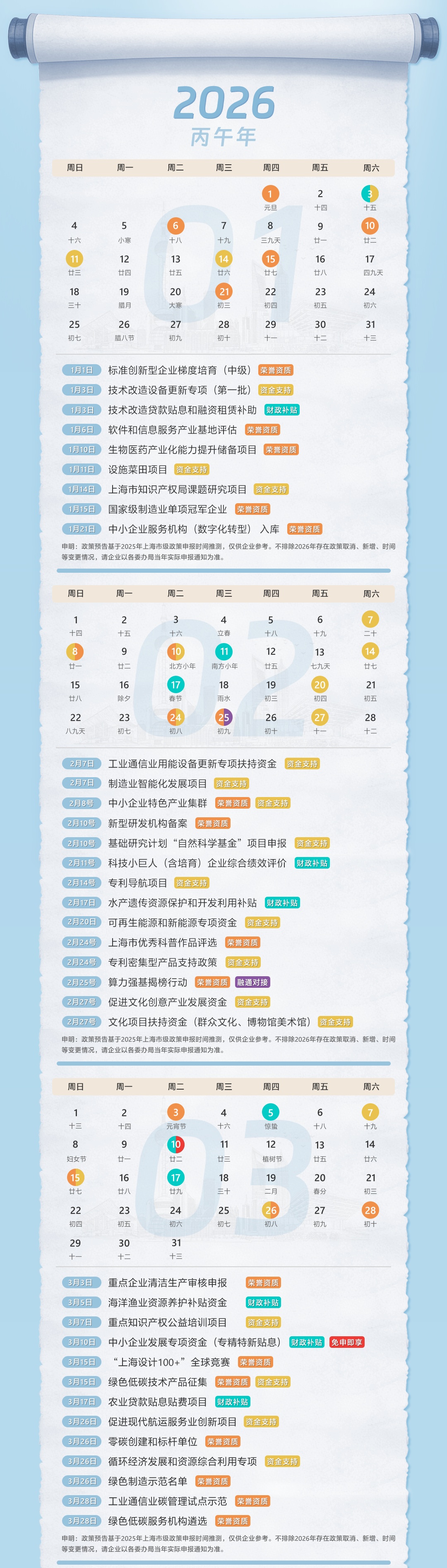 2026年为确保企业能合理安排申报时间,及时准备申报材料,企业服务云精心筛选和整理了部分重要市级申报政策,并按月排序,供企业申报参考。为便于企业日常查看,企业服务云贴心为大家准备了月历打印版本,欢迎通过文末二维码扫码下载。