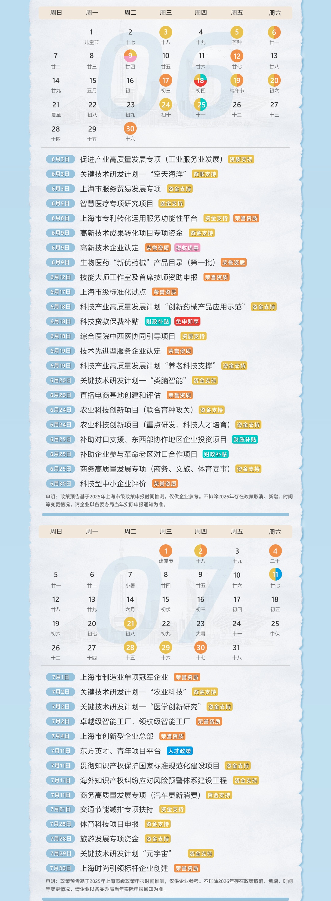 申明:以下政策预告基于2025年上海市级政策申报时间推测,仅供企业参考。不排除2026年存在政策取消、新增、时间变更等情况,请企业以各委办局当年实际申报通知为准。