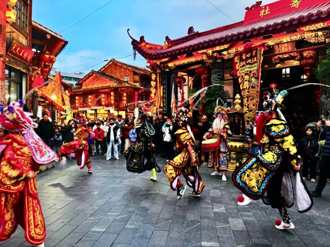 作者说:照片摄于福建莆田梅园路。英歌舞是潮汕传统民间舞蹈,国家级非遗,被称为中华战舞。它演绎水浒英雄故事,舞者画脸谱、持短棍,动作刚猛,融合武术和舞蹈,气势震撼,多用于春节、元宵等节庆,寓意驱邪纳福、团结勇猛。(三新思贤八2班 蔡咏潆)