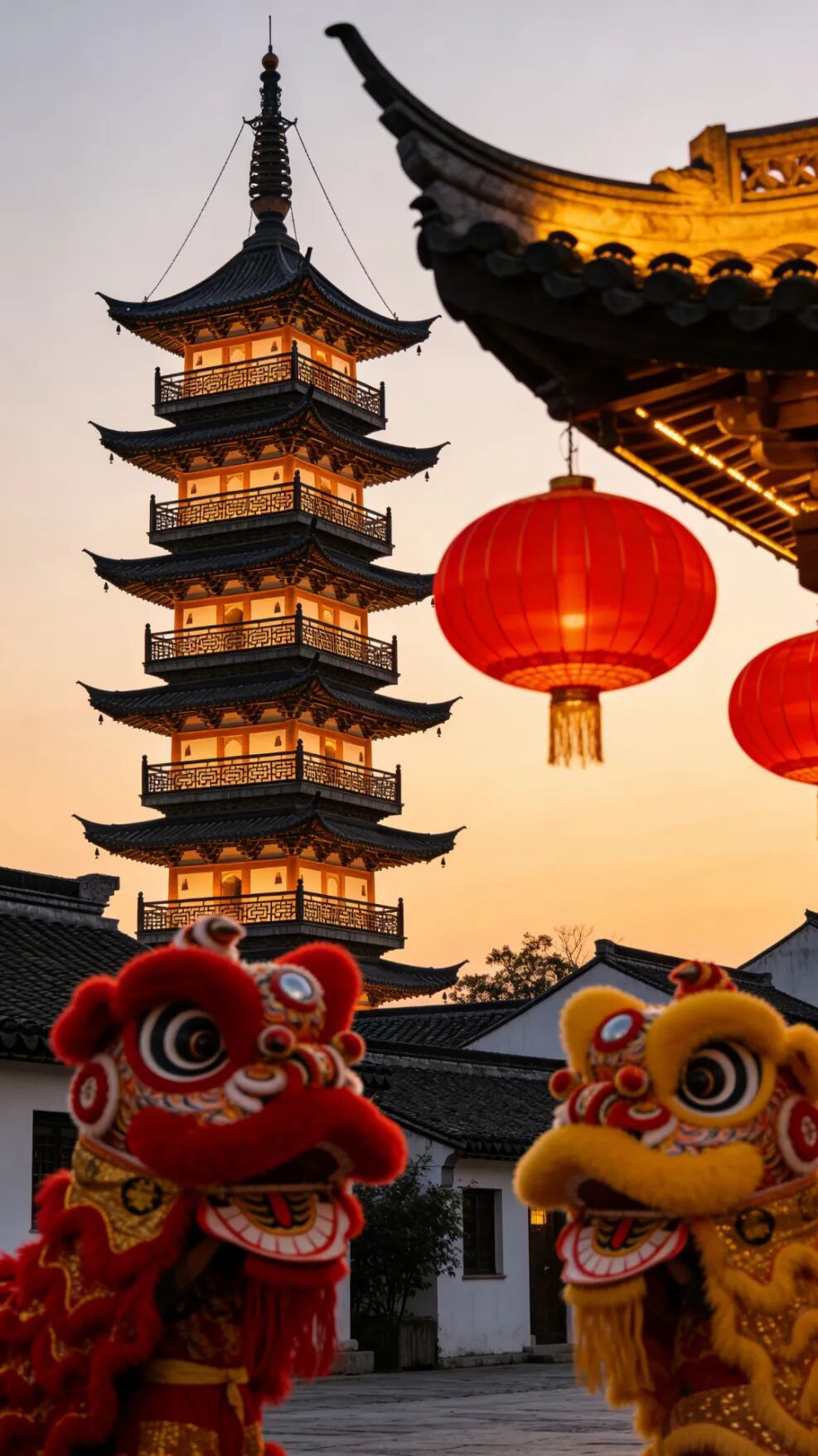 作者说:照片拍摄于松江方塔园。千年宋塔下,红黄醒狮腾跃,与檐下红灯笼相映。这是马年新春游园会的压轴表演,老建筑与新民俗碰撞,拍下这一瞬,留住松江最浓的传统年味。(松一附校七4班 楚美吉)