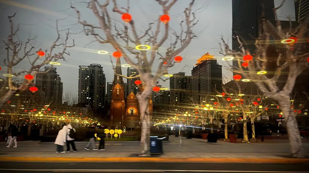 作者说:马上过年啦!今天姑奶奶一家要回澳洲,我们提前吃了团圆饭。接近年关,道路旁树木上,也被装扮了大红的灯笼和漂亮的光环。我坐在车里,赞叹美丽的街景。路过徐家汇的大教堂,教堂尖尖的屋顶也点着灯,在一排排灯笼的衬托下也过上了热闹的中国年,来往的游客不断留影,真是美!我不由自主按下拍照键,恰巧车子启动,一张流光溢彩的照片保存在了手机里。我们的春节是祖先留给我们的骄傲,未来中国年会是世界的节日,也将会有更多的外国友人了解中国了解春节!(上外松外七14班 张瑾瑜)