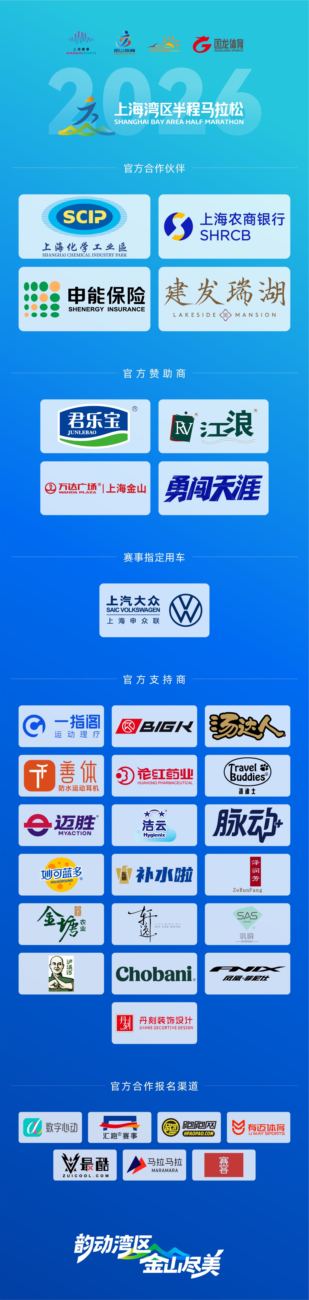 你们是赛事最有力的支持者,是这场滨海之约的同行者。你们以鼎力支持赋能赛事,用携手同行共筑精彩,为赛事的顺利开展提供了坚实的物资保障与资金支持,从赛事装备到补给物资,从宣传推广到现场保障,每一处细节都离不开你们的悉心投入与大力支持。你们与组委会同心同向、携手共进,用责任与担当,助力2026上海湾区半程马拉松绽放更耀眼的光芒,用实际行动,传递着对体育事业的热爱与支持,见证着每一份奔跑的力量。