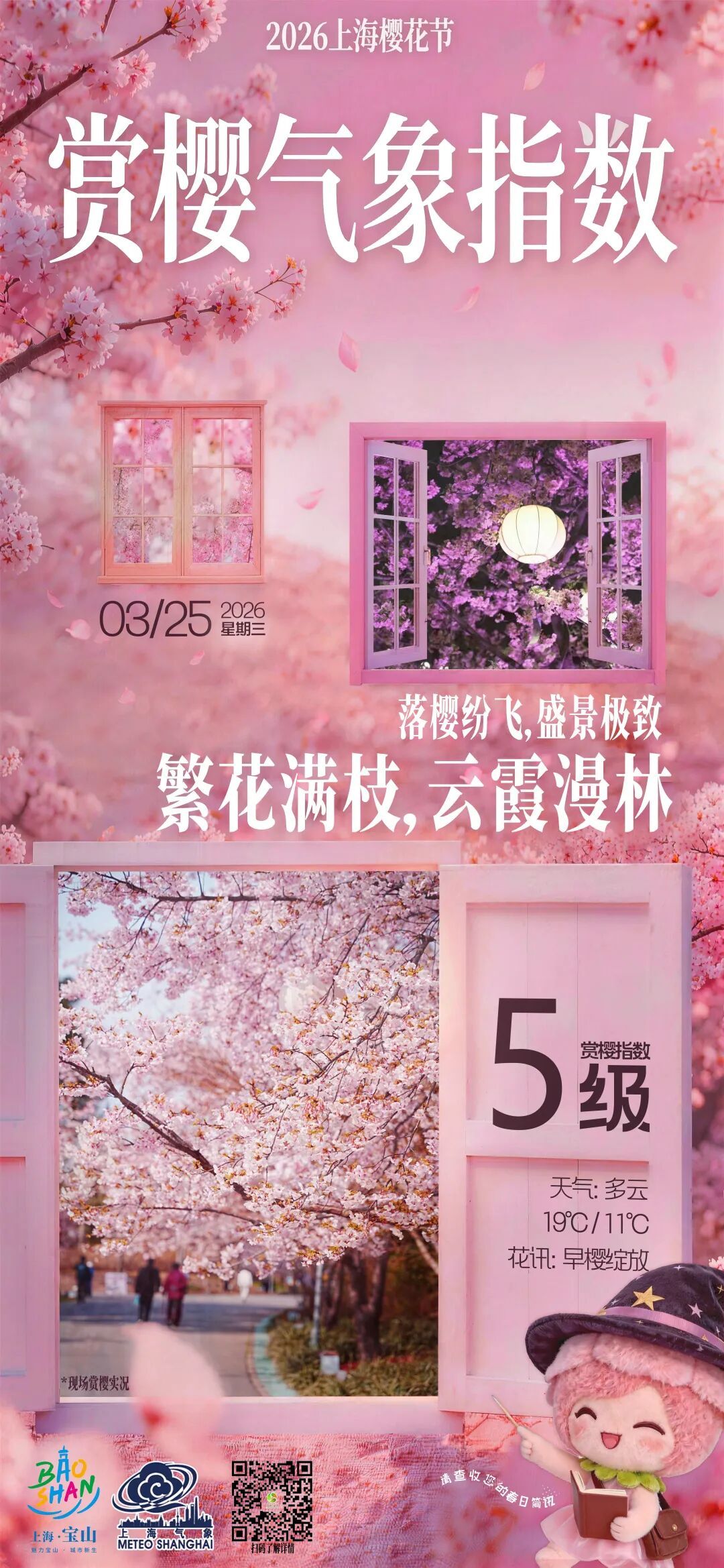 穿衣以舒适春装为主;夜樱观赏时园区温度稍降,请注意防寒保暖。