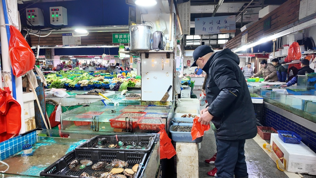 各个水产摊位前